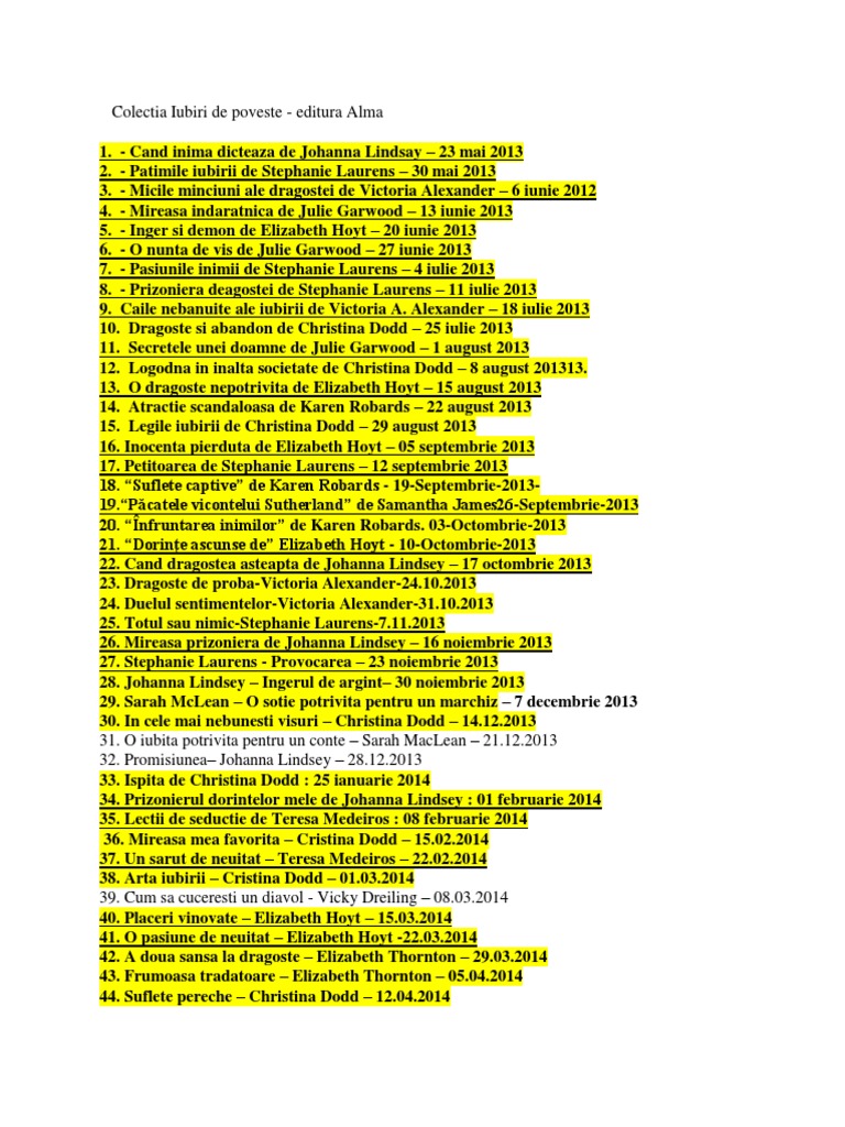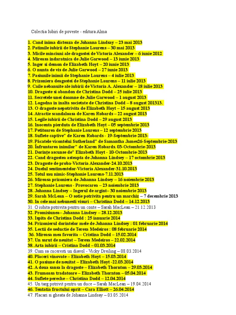 199 and 2 people voted. Scribd es red social de lectura y publicación más importante del mundo. Download lista carti colectia iubiri de poveste editura alma mai 2013 august 2018 save lista carti colectia iubiri de poveste editura alma mai 2013 august 2018 for later vicky dreiling cum sa cuceresti un diavol. 1 johanna lindsey cand inima dicteaza 2 stephanie laurens patimile iubirii 3.