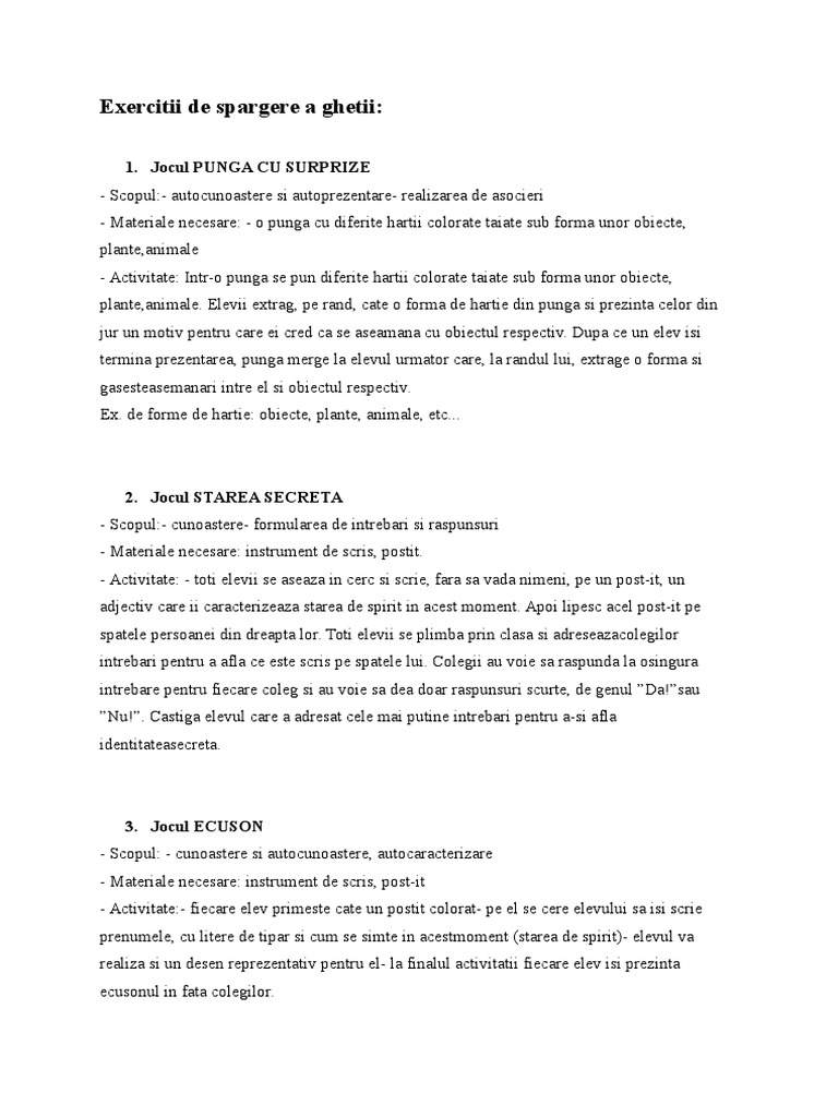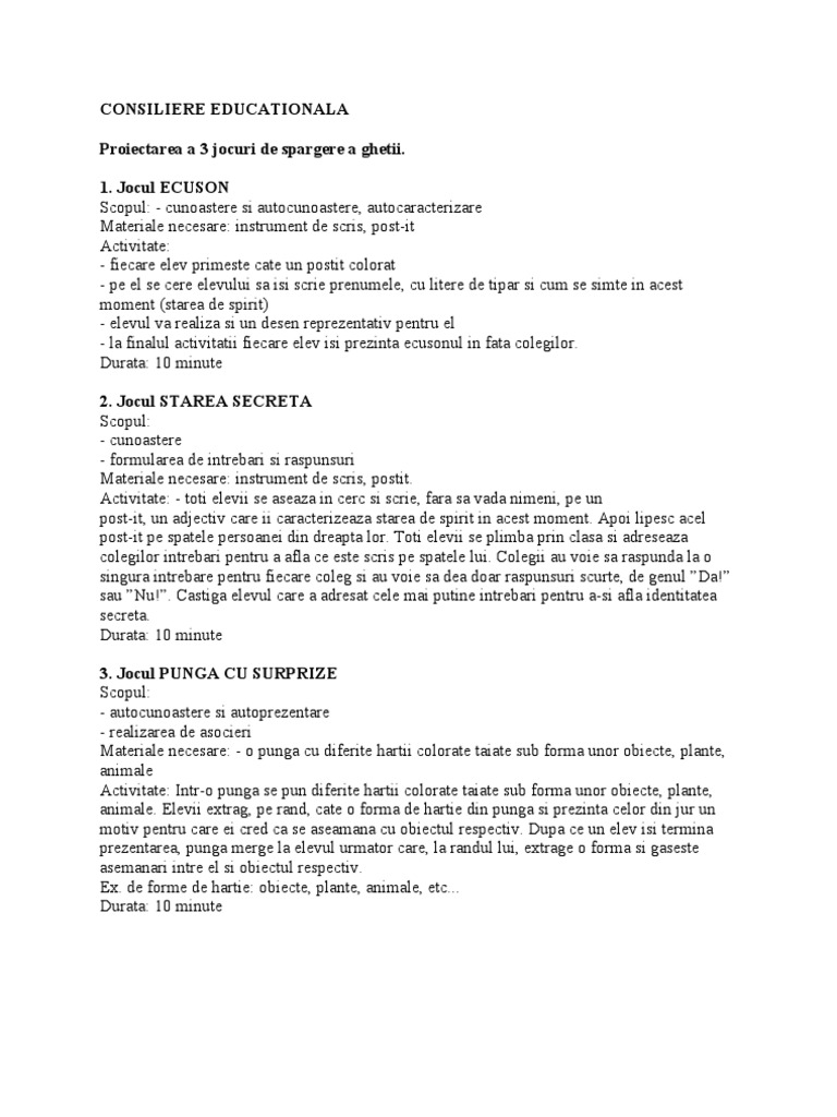 Aceste jocuri sunt activitati fizice care au scopul sa imbunatateasca circulatia sangvina in tot corpul inclusiv in creier astfel restabilind energia dupa o pauza sau o activitate indelungata. Carmen alexandra miricioiu școala gimnazială nr. 0 stele 0 review uri. Se intampla sa intampinati dificultati in mobilizarea elevilor pentru participarea la activitatile educative.
