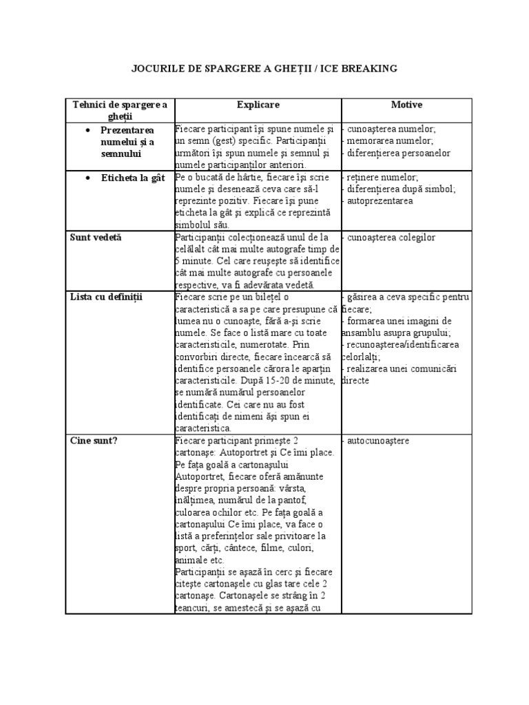 Sunt 5 fructe diferite pe hârtii spre exemplu. Metode de spargerea gheții captarea atenției și evaluarea activității 1 metode de spargerea gheții captarea atenției și evaluarea activității prof. Tema numele activitatii de ce m am prins. Icebreaking games jocuri de spargere a gheţii 1 prezentăm mai jos câteva din jocurile de spargere a gheţii utilizate de noi în trainingurile sau orele de consiliere derulate.