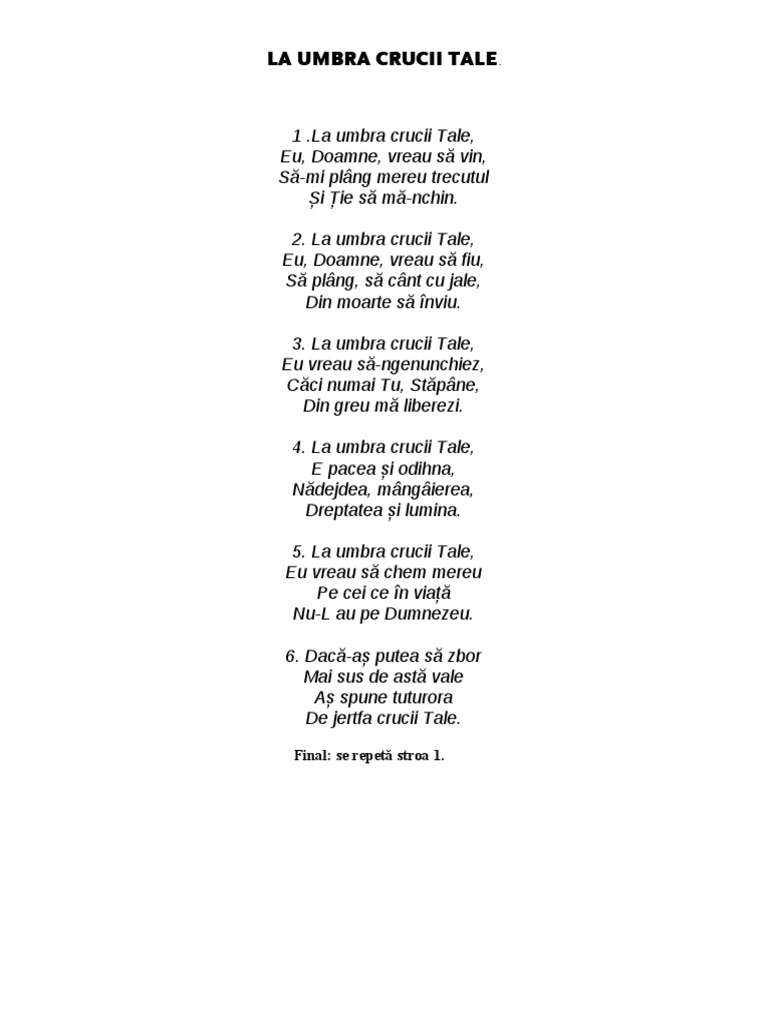 La umbra crucii tale eu doamne vreau sa vin sa mi plang mereu trecutul si tie sa ma nchin sa mi plang mereu trecutul si tie sa ma nchin la umbra crucii tale eu doamne vreau sa fiu sa plang sa cant cu jale din moarte sa inviu sa plang sa cant cu jale din moarte sa inviu la umbra crucii tale eu vreau sa ngenunchiez caci numai tu stapane din greu ma liberezi caci numai tu stapane din.