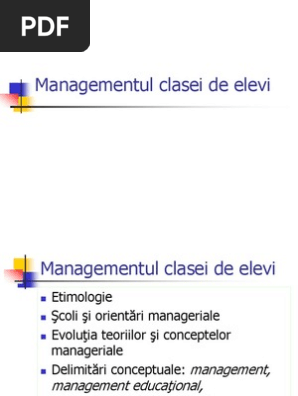 Managementul clasei de elevii curs3. Managementul clasei de elevi definire managementul clasei definit ca abilitatea profesională de planifica organiza activitaţile clasei astfel încât asigure un. începând din anii 60 s au întreprins o serie de studii asupra diverselor aspecte ale clasei de elevi în urma cărora s au desprins câteva dominante ale conceptului de management al clasei. Domeniu de cercetare n stiintele educatiei care studiaza att perspectivele teoretice de abordare ale clasei de elevi ct si structurile dimensional practice ale acesteia ergonomica psihologica psihosociala normativa relationala.