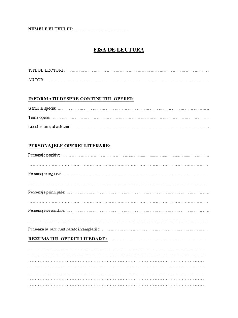 Fișe de lucru planșe jocuri didactice prezentări powerpoint cântece pentru copii texte suport imagini la dimensiuni și calitate de imprimare fișiere audio. Categoria cu paginile care contin fișe de lectură la diverse opere literare. Model de fisa de lectura pentru opera lirica duminică 24 octombrie 2010 10 33 fi. Ati putea omite niste lucruri ca si nota de lectura citatele preferate sau vocabularul.