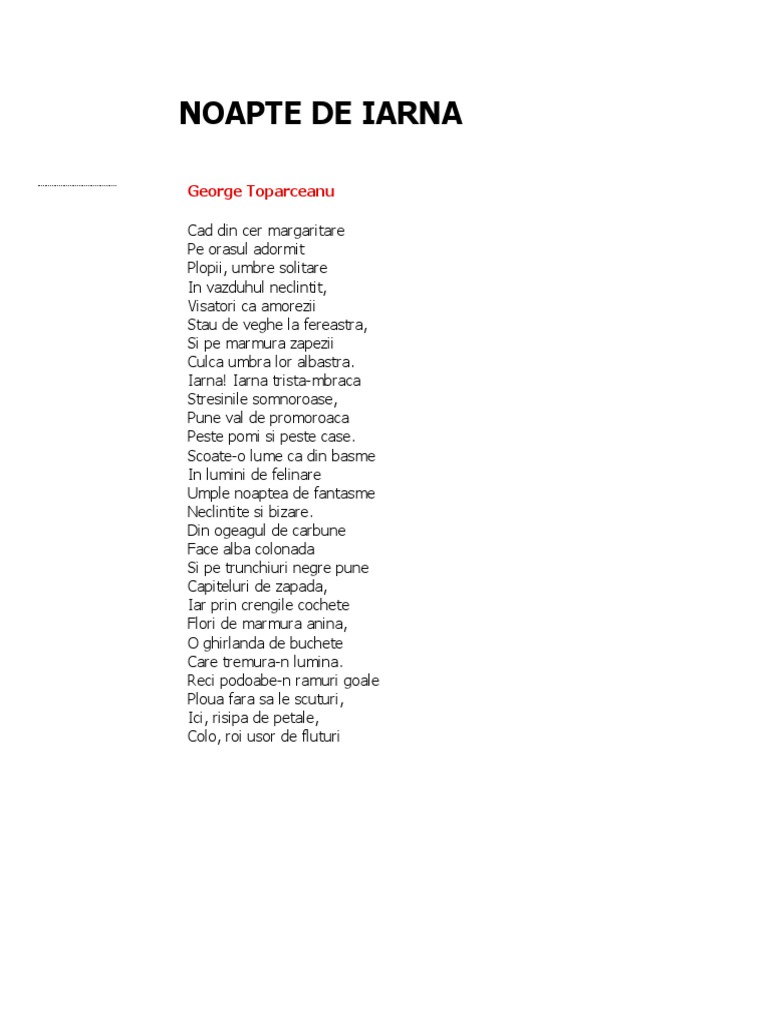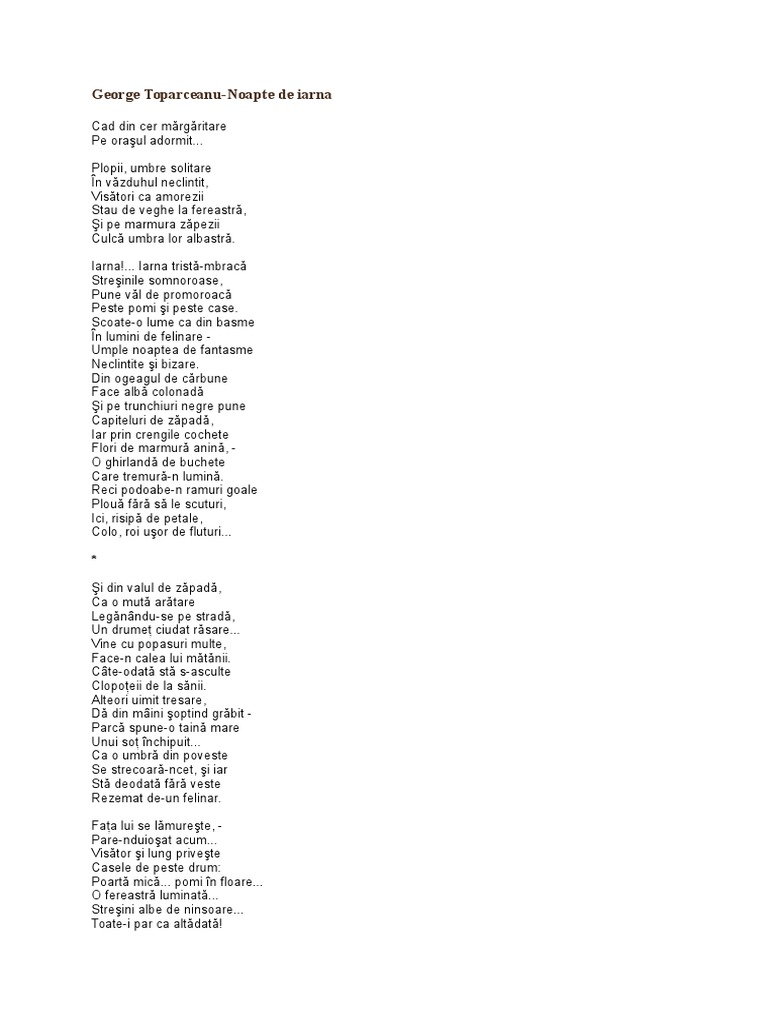 Scoate o lume ca din basme în lumini de felinare umple noaptea de fantasme neclintite şi bizare. Din ogeagul de cărbune face albă colonadă şi pe. Poezii de george topârceanu. Noapte de iarna in aceasta poezie imaginea anotimpului alb este prezentata intr un mod favorabil elementele plastice prefigurand trairi tonice si dorinta de viata.