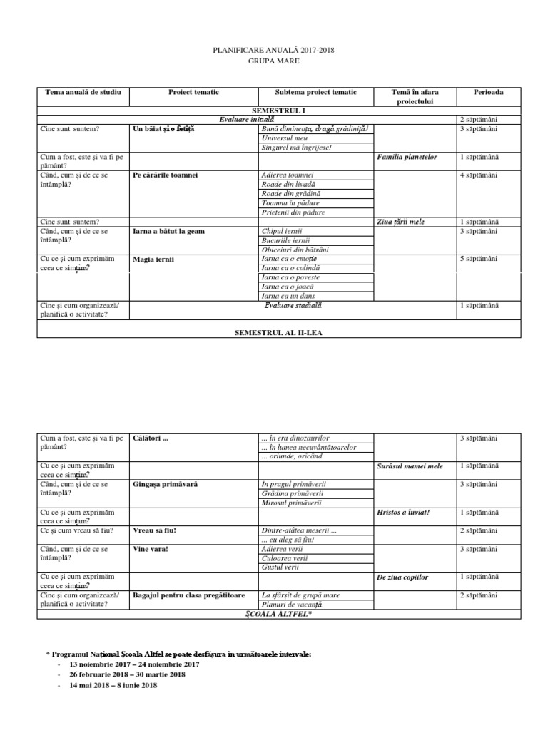 Planificare anuală pe teme pentru grupa mică an școlar 2018 2019. In varianta i temele sunt grupate conform temelor anuale de studiu tas iar in a ii a varianta temele sunt asezate in ordinea cronologica a saptamanilor anului scolar curent. Planificare anuală nivel i grupa mijlocie.