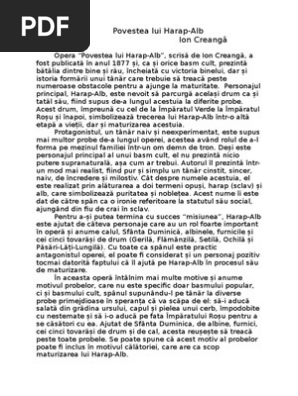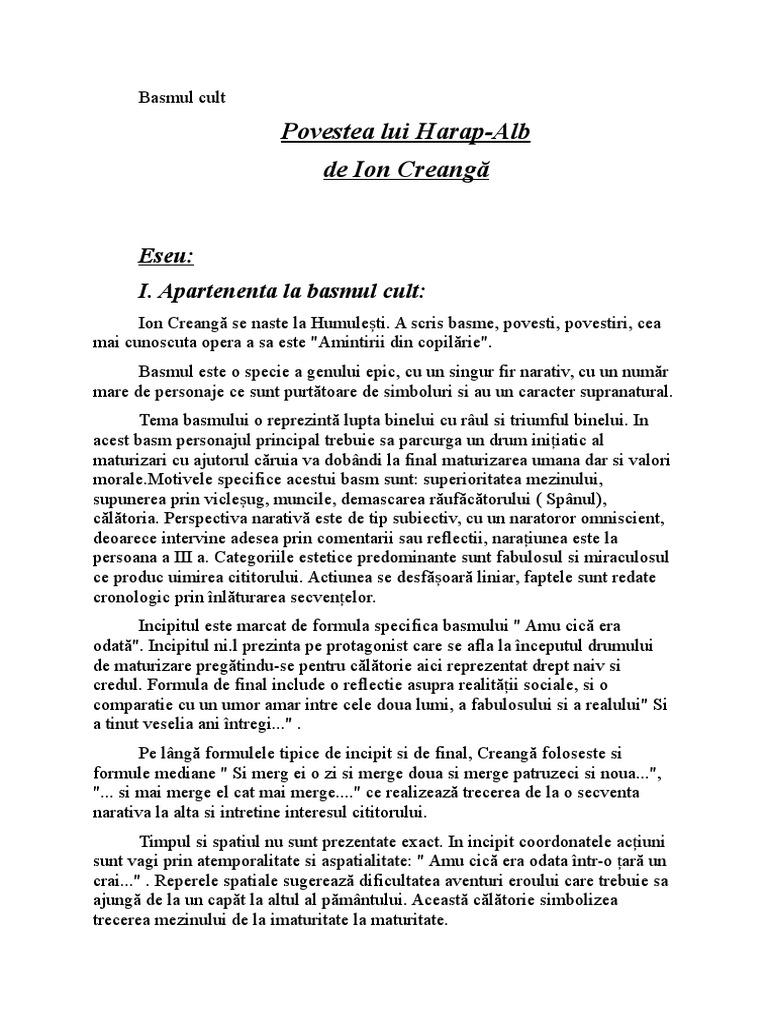 Povestea lui harap alb eseu. La inceput feciorul de crai nu are incredere in fortele proprii deoarece atunci cand tatal punandu l si pe fiul cel mic in acceasi situatie chiar daca el nu si a incercat norocul a spus. Povestea lui harap alb de ion creanga este un basm cult publicat in convorbiri literare 1877. Povestea lui harap alb schița analizei încadrarea într un curent specie mișcare specie basm prin. Povestea lui harap alb este un basm cult de o valoare artistică deosebită despre care putem spune că urmărește șablonul clasic al basmului popular prin tematica generală abordată aceea a luptei dintre bine și rău avem așadar un protagonist și un antagonist finaliztă cu supremația binelui.